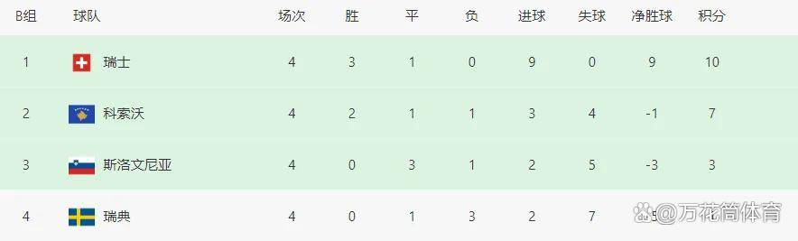 这场失利后,瑞典队在新一轮的世界杯预选赛中遭遇了令人沮丧的“4轮不胜”。1平3负仅积1分的他们,目前已落后小组头名瑞士队9分,仅剩两轮比赛,提前宣告无缘小组头名出线。而争夺小组第二的希望也变得愈发渺茫,他们落后科索沃6分,净胜球也少了4个。难道这支球队就要以“送分童子”的姿态,彻底告别本届世界杯了吗?